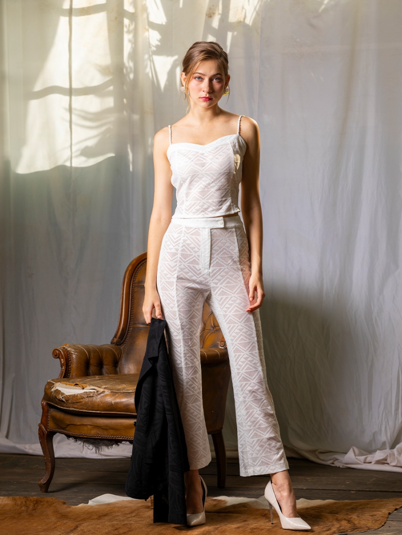 蕾絲鏤空的白色蕾絲馬甲加背心長褲帶來性感的感覺,同時保持了輕盈和優雅的氣質。由於蕾絲鏤空透氣材料,適合夏日或需要舒適但仍想保持時尚風格的場合穿著。另外,白色的中性色設計使其能夠輕鬆與黑色、粉紅色、藍色等搭配。